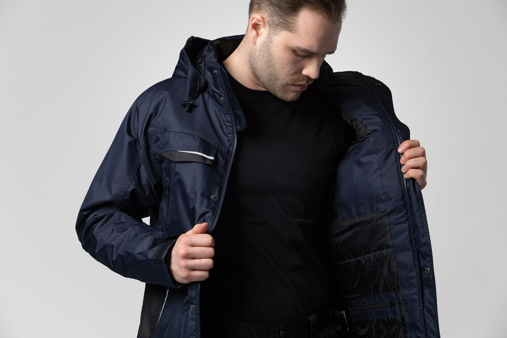 Fodrad vind- och vattentät skaljacka med tejpade sömmar. Tvåvägsdragkedja framtill med slag på yttersidan för att förhindra vinddrag samt genomträngning av väta, försluts med tryckknappar. Dubbla bröstfickor, två med lock och kardborreförslutning samt två med vattentäta dragkedjor. Sidfickor med dragkedja. En D-ring på vänster bröst för att fästa ID-kort. Tre rymliga innerfickor, varav två med dragkedja. Reflexdetalj på fickorna framtill samt i nederkant baktill. Reglerbar, avtagbar huva med tryckknappar. Reglerbar i midja med snodd, reglerbara ärmslut med kardborre. Förlängd i rygg. Innertyget är öppningsbart för att underlätta förädling.
