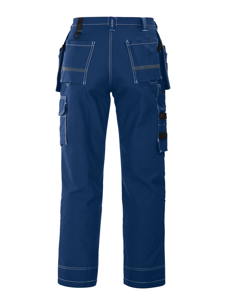 Klassisk hantverksbyxa i slitstark bomull. Undanstoppningsbara hängfickor med förstärkningar i Cordura®, den ena med extra fickor och den andra med hållare för verktyg. Benfickor, på vänster sida ficka med lock som försluts med tryckknapp, invändig telefonficka samt fäste för ID-kort. På höger sida ficka för tumstock samt verktygsficka med knivknapp. Bakfickor med övervidd. Två reglerbara hammarhankar samt två D-ringar, fästa i linningen. Förböjda knän. Knäskyddsfickor som går att reglera i två höjder, öppning inifrån. Hängfickor, bak på bensluten samt knän är förstärkta med Cordura® för ökad slitstyrka.