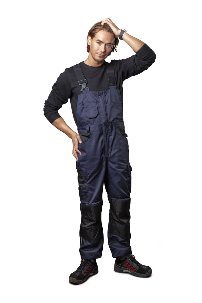 Hängselbyxa med undanstoppningsbara hängfickor. Elastiska, reglerbara hängslen med spännen framtill i plast. Bakfickor med lock och kardborrestängning. Benficka med extra fack och lock med kardborrestängning. Öppna bröstfickor, även telefonficka på höger sida som försluts med kardborre. Tvåvägsdragkedja framtill med ett täckande slag. Förstärkning i hängfickorna, tumstocksfickan och på knäskyddsfickorna för ökad hållbarhet. Reflexdetaljer på utsida ben. Förböjda knän med knäskyddsfickor som går att reglera i två höjder, öppning inifrån. C42-C64 kan förlängas med 5 cm genom ett utvik i benslutet.