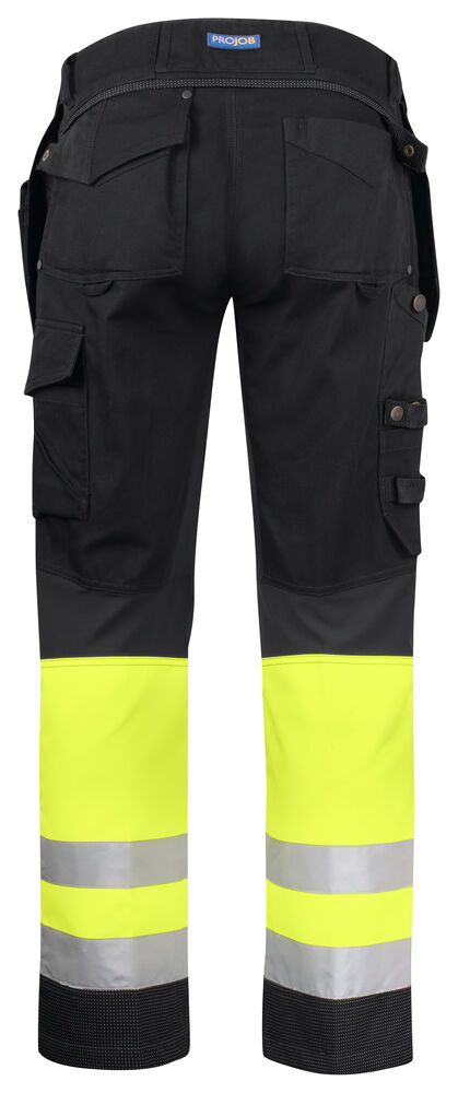 Hantverksbyxa med ergonomiskt vadderat ok baktill för bästa komfort. Avtagbara hängfickor med Cordura®förstärkt insida, den vänstra med extra fickor varav den ena med dragkedja, på höger sida hållare för verktyg. Benfickor, på vänster sida ficka med övervidd som försluts med tryckknapp, invändig telefonficka samt hållare för ID-kort. På höger sida ficka för tumstock samt verktygsficka med knivknapp. Bakfickor med övervidd, den vänstra med lock. Två reglerbara hammarhankar, en på vardera sida. Två D-ringar, fästa i linningen. Cordura®stretchtyg i gren för obegränsad rörlighet, även bak på och över knä för knäskyddsfixering. Förböjda knän för ökad komfort. Knäna är förstärkta med Kevlar för ökad slitstyrka. Knäskyddsfickor som går att reglera i två höjder, öppning inifrån. Reflexdetaljer samt fluorescerande material i bensluten. Hängfickor, bak på bensluten samt knän är förstärkta med Cordura® för ökad slitstyrka.