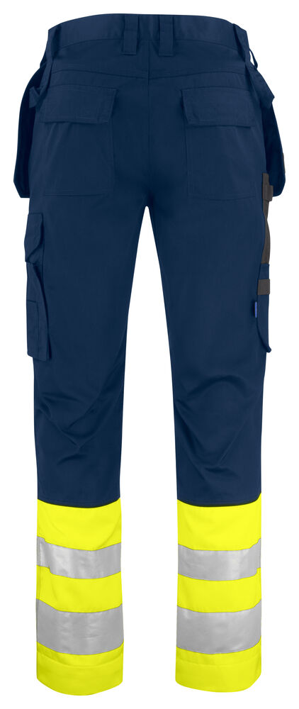 Hantverksbyxa med undanstoppningsbara hängfickor, den vänstra med extra fickor varav den ena försluts med dragkedja, på höger sida öppna fickor samt hållare för verktyg. Benfickor, på vänster sida ficka med övervidd samt telefonficka, försluts med kardborre. På höger sida tumstocksficka samt verktygsficka med knivknapp. Två hammarhankar, en på vardera sida. Bakfickor med lock, försluts med kardborre. Förstärkning i hängfickor, tumstocksfickan och över knäna för ökad slitstyrka. Förböjda knän med knäskyddsfickor som går att reglera i två höjder, öppning inifrån. C42-C64 kan förlängas med 5 cm genom ett utvik i benslutet.