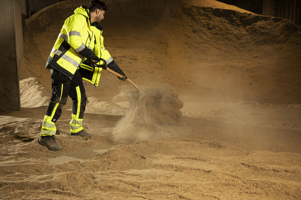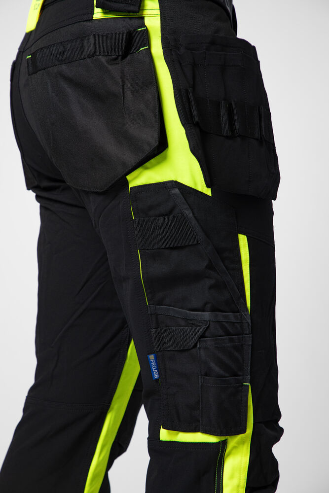 Hantverksbyxa i stretch för maximal rörelsefrihet. Modern passform. Fyrvägsstretch över lår och bak. Sidorna upptill är inte i stretch för att ge bättre stadga åt byxan. Hängfickor med Cordura®förstärkt insida, varav den ena med dragkedja. Hängfickorna går att ta av genom att sprätta en kontrastfärgad, dold tråd. Benfickor, på vänster sida med plats för verktyg och penna, även en mobilficka med magnetlås och fäste för ID-kortshållare. På höger sida tumstocks- och verktygsficka med knivknapp. Fästen för verktygshållare. Förböjda knän. Knäskyddsfickor som går att reglera i två höjder, öppning inifrån. Cordura®förstärkning över knä, lår, bakfickor, nederkant av ben samt hängfickor. Segmenterade reflexer från 3M.