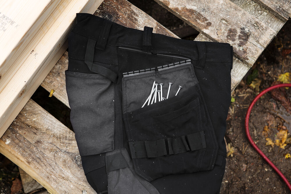 Hängfickor som passar till Projobs byxor och shorts som är försedda med spårskena. Förstärkta invändigt med polyamid, Cordura®. På ena sidan tillägg för extra fickor, både öppna fickor samt en mindre med dragkedja för bits eller annat smått. På den andra sidan öppna fickor samt hållare för verktyg. Anpassa byxan efter behov genom att fästa ficka på vänster eller höger sida, eller på båda.