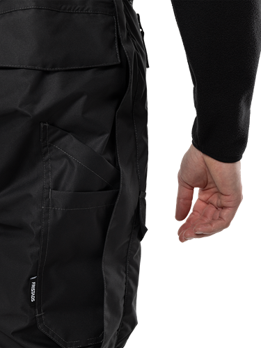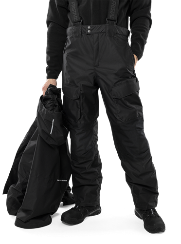 Airtech®, vatten- och vindtät med andasfunktion / Tejpade sömmar / Avtagbara elastiska hängslen / Linning som är förhöjd baktill med resår i sidorna och hällor / Gylf med dragkedja / 2 fleecefodrade framfickor med dragkedja / Bakficka med dragkedja och lock med kardborrefäste / 2 rymliga benfickor med lock och tryckknapp / Tumstocksficka med verktygsficka / Knäfickor av CORDURA® med öppning inifrån / Knäskydden i knäfickorna kan höjdjusteras / Dolda 2-vägs dragkedjor längs hela utsidan av benen, under slå med kardborrefäste / Reglerbara benslut med kardborrefäste / Invändiga snölås / Reflexdetaljer på bakbenen / Vattenpelare 20.000 mm / Andasfunktion Airtech®-material RET <15 / Godkänd enligt EN 343 klass 4/4 och EN 14404 tillsammans med knäskydd 124292 / OEKO-TEX®-certifierad.