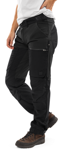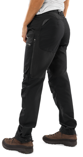 Återvunnet och ekologiskt material / 4-vägs stretchpartier fram, i sidor, gren, ok och baksida lår / Fluorkarbonfri vattenavvisande (DWR) impregnering på framsida lår, stuss och nederdel av ben / YKK-dragkedjor / Svarta reflexdetaljer / Linning med resår i sidorna / Förlängd bälteshälla / Dubbel förstärkt grensöm / 2 framfickor / 2 lårfickor med dragkedja och bälg, varav en med mobilficka / Mesh-ventilation med dragkedja längs lårens utsida / Knäfickor med öppning utifrån / Elastiska benslut, reglerbara med tryckknappar / Dold kängkrok / OEKO-TEX®-certifierad.