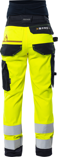 Stretchmaterial / Multinorm / Inherent flamskydd / Smuts-, olje- och vattenavvisande / Metallfri / Överdel av kraftigt ribbstickad material med 4-vägsstretch med mjuk infälld resår / Reglerbar midja med inbyggd resår / Lågt skuren linning med hällor och knapp, men ingen dragkedja / 2 framfickor / 2 förstärkta bakfickor, varav en med lock och dold tryckknapp / Hammarhank / Förstärkt tumstocksficka med pennficka samt knapp och hälla för kniv / Benficka med lock och dold tryckknapp, telefonficka och hällor för id-kort / Förstärkta knäfickor med öppning inifrån / Knäskydden i knäfickorna kan höjdjusteras / Förstärkta benslut / Godkänd enligt EN 61482-1-2 APC 1, EN 61482-1-1 ELIM: 8 cal/cm² (ingår i ljusbågecertifierade plaggkombinationer), EN ISO 11612 A1 B1 C1 F1, EN 1149-5, EN ISO 20471 klass 2 och EN 14404 tillsammans med knäskydd 124292 / Materialet är godkänt enligt EN 13034 / Certifierad efter 50 tvättar / Testad för industritvätt enligt ISO 15797 / OEKO-TEX®-certifierad.