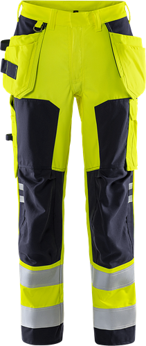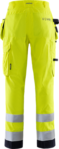 Multinorm / Inherent flamskydd / Smuts-, olje- och vattenavvisande / Dold knapp fram / 2 löst hängande CORDURA®-förstärkta spikfickor – den ena med 3 fickor och verktygshällor, den andra med extra ficka / 2 framfickor / 2 CORDURA®-förstärkta bakfickor, varav en med lock / D-ring vid linningen / Hammarhank / Dubbel förstärkt grensöm / CORDURA®-förstärkt tumstocksficka med verktygsficka, pennficka samt knapp och hälla för kniv / Benficka med lock och dolda tryckknappar, telefonficka och hälla för id-kortshållare / Förstärkning i kontrastfärg på lår / Förböjda ben / CORDURA®-förstärkta knäfickor med öppning inifrån / Knäskydden i knäfickorna kan höjdjusteras / CORDURA®-förstärkta benslut / Reflexerna är påsydda med 2-nålssöm / Godkänd enligt EN 61482-1-2 APC 1, EN 61482-1-1 ELIM: 9 cal/cm² (se ljusbågetabell för certifierade plaggkombinationer av EN 61482-1-2 klass 2 och EN 61482-1-1), EN ISO 11612 A1 A2 B1 C1 F1, EN 1149-5, EN ISO 20471 klass 2, EN 14404 tillsammans med knäskydd 124292 och tyget är godkänt enligt EN 13034 / Certifierad efter 50 tvättar / Testad för industritvätt enligt ISO 15797 / OEKO-TEX®-certifierad.