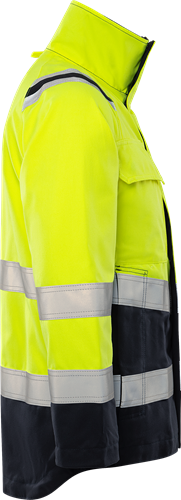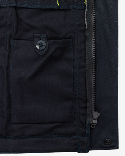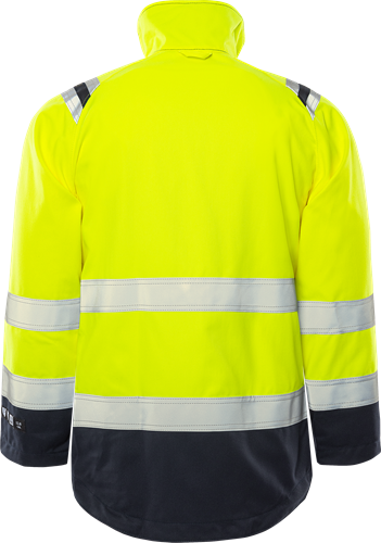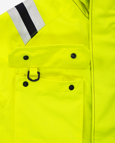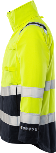 Multinorm / Inherent flamskydd / Smuts-, olje- och vattenavvisande / Dragkedja upp i kragen, under frontslå med dolda tryckknappar / Rymlig bröstficka med invändig D-ring, pennhälla och dolda tryckknappar / Bröstficka med vertikal dragkedja / Dolda knappar och hällor för kniv / Mikrofonhållare / Innerficka med knapp / Invändig telefonficka med kardborrelås och hälla för hörsnäcka / 2 framfickor med dragkedja / Reglerbart ärmslut med tryckknapp / Dragsko i nederkant / Förlängd rygg / Reflexerna är påsydda med 2-nålssöm / Godkänd enligt EN 61482-1-2 APC 1, EN 61482-1-1 ELIM: 9 cal/cm² (se ljusbågetabell för certifierade plaggkombinationer av EN 61482-1-2 klass 2 och EN 61482-1-1), EN ISO 11612 A1 A2 B1 C1 E2 F1, EN ISO 11611 A1 A2 klass 1 (se flam- och svetstabell för certifierade plaggkombinationer), EN 1149-5, EN 13034 Typ PB [6] och EN ISO 20471 klass 2 för XS och klass 3 för S-3XL / Certifierad efter 50 tvättar / Testad för industritvätt enligt ISO 15797 / OEKO-TEX®-certifierad.