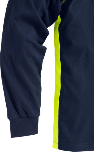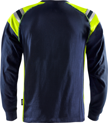 Flamskyddad T-shirt med förhöjd synbarhet som har skydd mot ljusbåge. Långärmad multinorm T-shirt av mjukt material med inherent flamskydd som är godkänd för industritvätt.