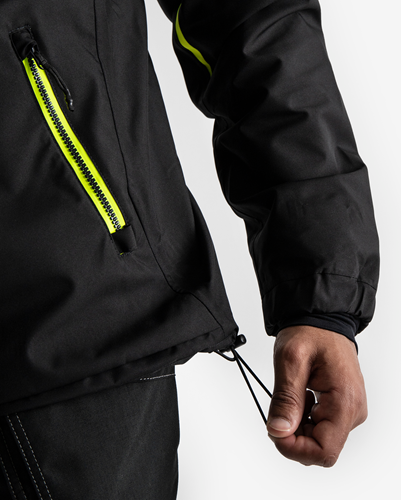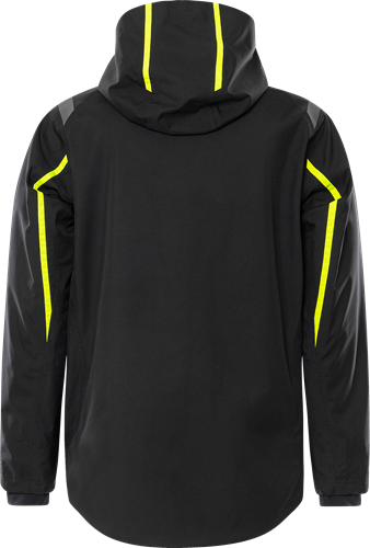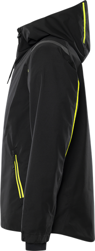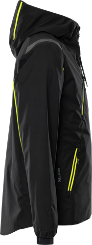 GORE-TEX-material, vatten och vindtät med andasfunktion / Tejpade sömmar / Reglerbar huva med dragsko / Huvan kan vikas ner och fästas / Dragkedja ända upp i kragen / Svarta reflexdetaljer på axlarna / Bröstficka med dragkedja / Invändig kartficka / 2 framfickor med dragkedja / Invändig elastisk mudd i ärmslut / Dragsko i nederkant / Förlängd rygg / Dragkedja i foder för transfer eller brodyr / Taft- och meshfoder / Vattenpelare > 10.000 mm / ePTFE membran / Andasfunktion RET < 2,5 / Godkänd enligt EN 343 klass 4/4 / OEKO-TEX®-certifierad.
