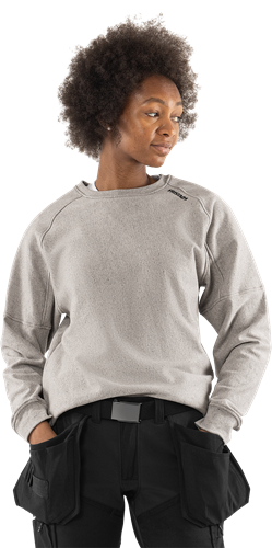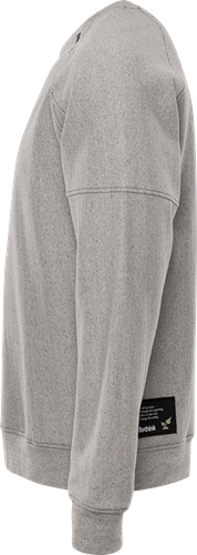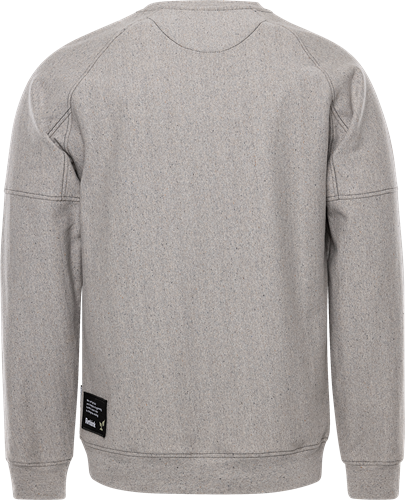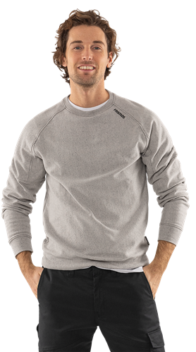 Delvis av cirkulärt material från insamlade arbetskläder och återvunnet material / Miljödeklarerad (EPD) / Ribbstickad halskant och muddar i ärmslut och nederkant / Raglanärm / Borstad insida / Svarta kontrastsömmar / EPD reg.nr 13236 på environdec.com