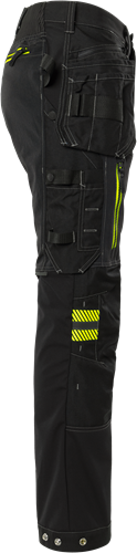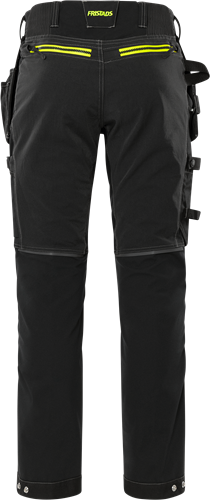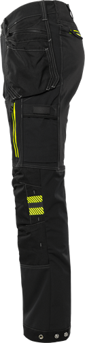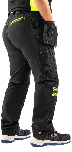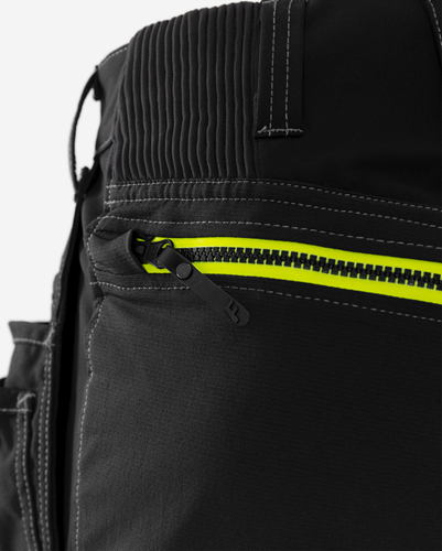 Delvis återvunnet och biobaserat material / Material med 4-vägsstretch / Slitstarkt ripstop-material med 4-vägs stretch på lår och baksida / Mycket elastiska stretchpartier ”smock” i midjan / 2 löst hängande spikfickor i CORDURA® med fickor med dragkedja i ovankant, den ena med 3 mindre fickor och verktygshällor, den andra med extra ficka / D-ring under löst hängande ficka / 2 framfickor / 2 bakfickor med dragkedja / Hammar