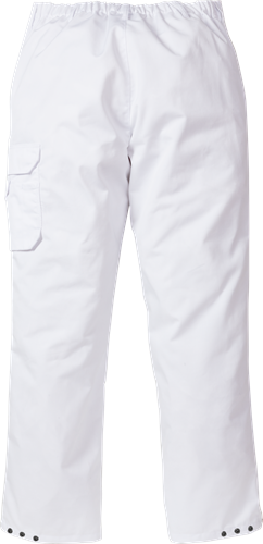 Anpassad för standarden DIN 10524 / Reglerbar midja med resår bak / Gylf med metalldragkedja / 2 framfickor med dolda tryckknappar / Benficka och telefonficka med lock och dolda tryckknappar / Reglerbara benslut / Kan zon-märkas med sublimeringstryck eller brodyr / Testad för industritvätt enligt ISO 15797 / OEKO-TEX®-certifierad.