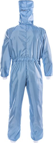 Overall med huva som är anpassad för renrum och kontrollerade miljöer. Tillverkad av ett tekniskt avancerat material som fungerar som ett filter och skyddar omgivningen. ISO klass 3.