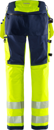 Delvis biobaserat och återvunnet material / Miljödeklarerad (EPD) / 4-vägs stretchmaterial / Ribbstickade stretchpartier i midjan / Slitstarkt ripstop-material med 4-vägsstretch på stuss och baksida lår / Dold knapp fram / 2 löst hängande CORDURA®-förstärkta spikfickor – den ena med ficka med dragkedja, 3 mindre fickor och verktygshällor, den andra med extra ficka / D-ring under spikfickan / 2 framfickor / 2 bakfickor med lös botten, varav en med dragkedja / Dubbel förstärkt grensöm / Hammarhank / CORDURA®-förstärkt tumstocksficka med verktygsficka, pennficka samt knapp och hälla för kniv / Benficka med tryckknapp, ficka med dragkedja och D-ring / Knäfickor i CORDURA® med öppning inifrån / Knäskydden i knäfickorna kan höjdjusteras / CORDURA®-förstärkt benslut / Dold kängkrok / Godkänd enligt EN ISO 20471 klass 2, EN 14404 tillsammans med knäskydd 124292 och EN 13758-2 UPF 40+ UV-skydd / Certifierad efter 50 tvättar / EPD reg.nr 3887 på environdec.com / OEKO-TEX®-certifierad.