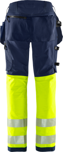 Delvis biobaserat och återvunnet material / Miljödeklarerad (EPD) / 4-vägs stretchmaterial / Ribbstickade stretchpartier i midjan / Slitstarkt ripstop-material med 4-vägsstretch på stuss och baksida lår / Dold knapp fram / 2 löst hängande CORDURA®-förstärkta spikfickor – den ena med ficka med dragkedja, 3 mindre fickor och verktygshällor, den andra med extra ficka / D-ring under spikfickan / 2 framfickor / 2 bakfickor med lös botten, varav en med dragkedja / Dubbel förstärkt grensöm / Hammarhank / CORDURA®-förstärkt tumstocksficka med verktygsficka, pennficka samt knapp och hälla för kniv / Benficka med tryckknapp, ficka med dragkedja och D-ring / Knäfickor i CORDURA® med öppning inifrån / Knäskydden i knäfickorna kan höjdjusteras / CORDURA®-förstärkt benslut / Dold kängkrok / Godkänd enligt EN ISO 20471 klass 1, EN 14404 tillsammans med knäskydd 124292 och EN 13758-2 UPF 40+ UV-skydd / Godkänd efter 50 tvättar / EPD reg.nr 4489 på environdec.com / OEKO-TEX®-certifierad.