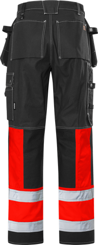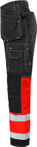 FAS® bomull / 2 löst hängande CORDURA®-förstärkta undanstoppningsbara spikfickor – den ena med extra ficka, den andra med 3 mindre fickor och verktygshällor / 2 rymliga fram- och bakfickor / 2 hammarhankar / 2 D-ringar / Tumstocksficka i CORDURA® med pennficka, ficka för verktyg eller extra kniv, 2 knivknappar och hälla / Benficka med tryckknapp, telefonficka och extra ficka med hälla för id-kortshållare / Knäfickor i CORDURA® med öppning inifrån / Knäskydden i knäfickorna kan höjdregleras / Godkänd enligt EN ISO 20471 klass 1 och EN 14404 tillsammans med knäskydd 124292 / OEKO-TEX® certifierad.