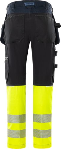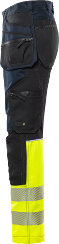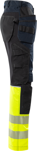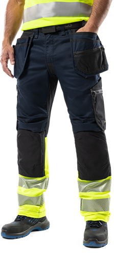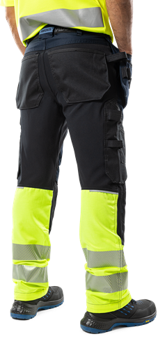 Delvis återvunnet material / Mekanisk stretch / Stora partier med 4-vägsstretch bak och i grenen / Segmenterade reflexer / 2 löst hängande spikfickor, helfodrade med extra slitstarkt material – den ena med 3 mindre fickor och verktygshällor, den andra med 2 fickor varav en med dragkedja / 2 framfickor / 2 bakfickor av extra slitstarkt material / Extra hällor för t ex id-kort vid linningen / Dubbel förstärkt grensöm / Hammarhank / Tumstocksficka av extra slitstarkt material med pennficka samt knapp och hälla för kniv / Rymlig benficka av extra slitstarkt material som även kan användas för tumstock, extra ficka med dragkedja / Knäfickor i CORDURA® med öppning utifrån, uppifrån / Knäskydden i knäfickorna kan höjdjusteras / Extra benupplägg, kan förlängas 5 cm / Godkänd enligt EN ISO 20471 klass 1 och EN 14404 tillsammans med knäskydd 124292 / Certifierad efter 50 tvättar / OEKO-TEX®-certifierad.