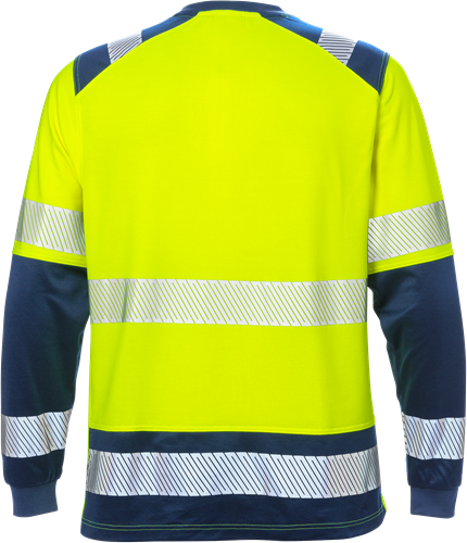 Transporterar fukt / Snabbtorkande / Stretchmaterial / Bomull på insidan / Stretch-reflexer / Ribbstickad halskant och ärmmudd / Godkänd enligt EN ISO 20471 klass 2 och EN 13758-2 UPF 40+ UV-skydd / Certifierad efter 25 tvättar / OEKO-TEX®-certifierad.