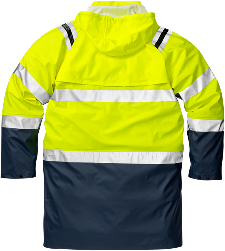 Vattentätt stretchmaterial / Svetsade sömmar / Avtagbar, reglerbar huva / Tvåvägs dragkedja under tryckknappslå / Ventilation i ok fram och bak / Dold D-ring för id-kortshållare / 2 dolda framfickor, den ena med invändig telefonficka / Reglerbart ärmslut / Godkänd enligt EN ISO 20471 klass 2 för 2XS och klass 3 för XS-3XL samt EN 343 klass 4/1 / OEKO-TEX®-certifierad.
