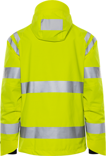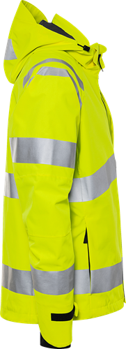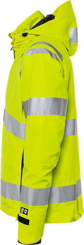 Återvunnet material / Material med 4-vägsstretch / Vatten- och vindtät med andasfunktion / Tejpade sömmar / Avtagbar och reglerbar huva med förstärkt framkant / Fleecefodrad krage / Vattenavvisande dragkedja ända upp i kragen med invändig slå / Bröstficka med dold vertikal dragkedja och invändig hälla för id-kortshållare / Framfickor med dragkedja / Innerficka i mesh med elastisk kant / Förböjda ärmar / Reglerbart ärmslut med rundad ovansida / Invändig elastisk mudd med tumgrepp / Dragsko i nederkant / Förlängd rygg / Dragkedja i foder för transfer / Vattenpelare 13.000 mm / Andasfunktion RET < 15 / Godkänd enligt EN ISO 20471 klass 3 och EN 343 klass 4/4 / Certifierad efter 20 tvättar / OEKO-TEX®-certifierad.