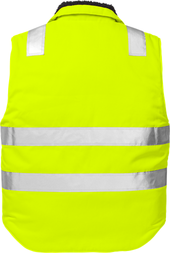 Pälsfiberfodrad varselväst i slitstarkt material som är smuts-, olje- och vattenavvisande. Framfickor med värmande foder.