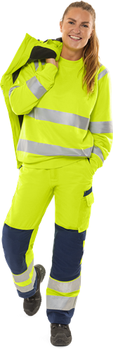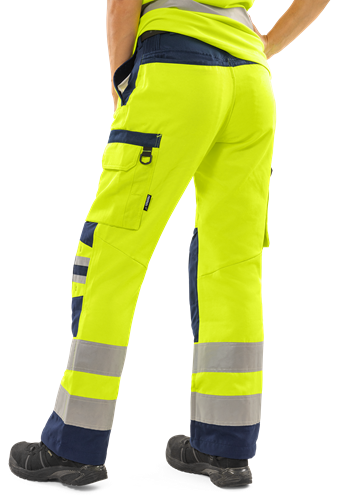 Miljödeklarerade varselbyxor till dam med stretchpartier i midjan för extra komfort. Bekväma arbetsbyxor med praktiska fickor, tillverkade i ett lätt och slitstarkt material av återvunnen polyester och ekologisk bomull. Har EPD (Environmental Product Declaration). Koncept: Trofta