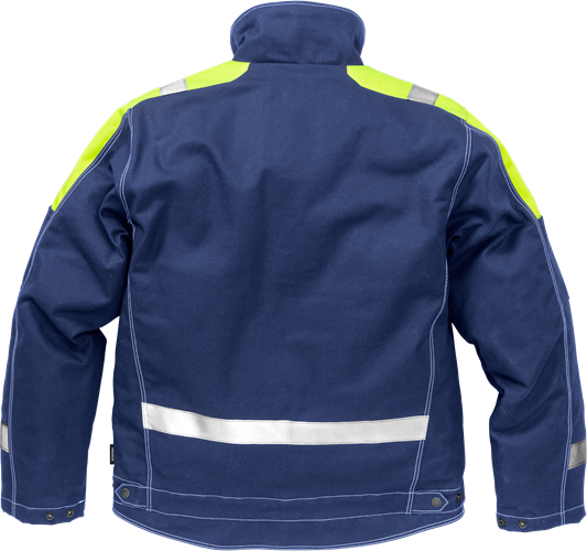 FAS® bomull / Vattenavvisande / Pälsfiberfodrad med quiltade ärmar / Reflexer på axlar, rygg och ärmar / Dragkedja upp i kragen under frontslå / 2 bröstfickor med lock och knapp, den ena med knapp och hälla för kniv, den andra med verktygshällor / Innerficka med knapp / Invändig telefonficka / 2 fodrade framfickor / Ärmficka / Reglerbar i ärmslut och nederkant / Förlängd rygg / / Dragkedja i foder för transfer och brodyr / Godkänd enligt EN 342 / OEKO-TEX®-certifierad.